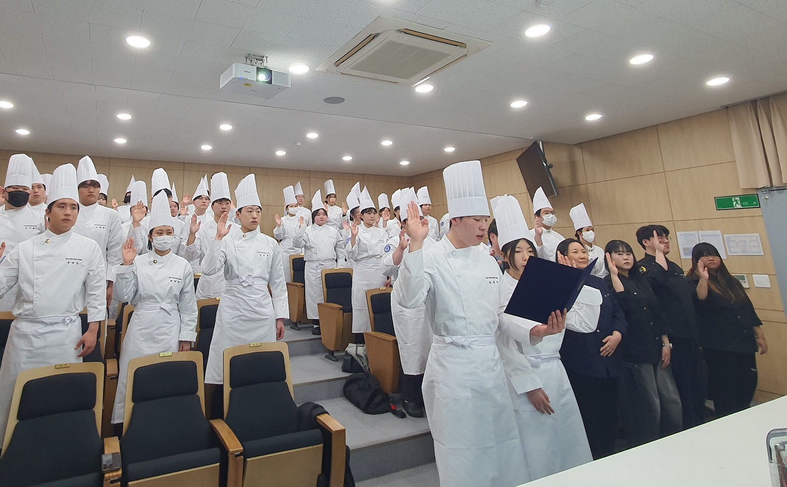깔끔한 하얀 조리복을 맞춰 입고 학과 유니폼에 대학 마크와 학과뱃지와 자격증 뱃지를 부착한 후 더 좋은 셰프로 성장하겠다고 다짐하는 선서식입니다.
