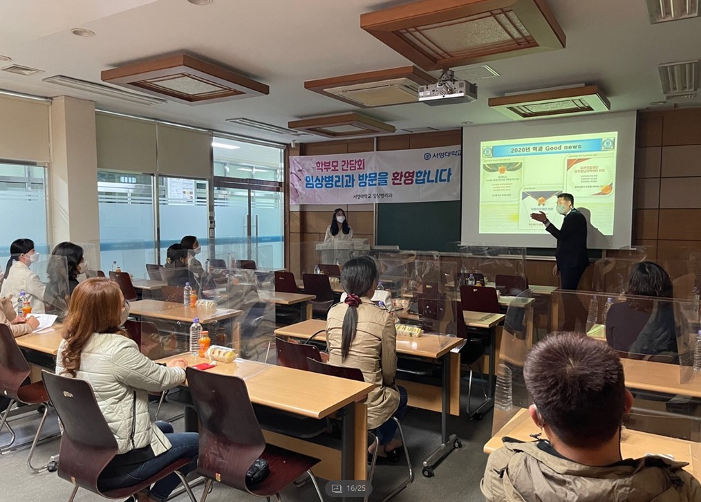 서영대학교 임상병리과에서는 2021학년도 학부모님을 초청하여 학과소개 및 향후 면허취득과 취업을 위한 학과의 노력에 대해 학부모님과 소통의 시간을 마련하였습니다. 늦은 시간에도 불구하고 학과장(조영국교수)을 비롯한 소속교수님들과 3학년 학부모님 20여분이 함께 학생들의 면허취득과 취업에 대한 다양한 정보와 4학년 전공심화 학사과정에 대한 높은 관심속에서 1시간이 넘는 열띤토론의 시간을 가졌습니다. 이자리에서 2021학년도 3학년 지도를 맡은 조영국교수님은 3학년 학생들의 면허취득을 위한 학습활동의 필요성과 이를 위한 지원노력 그리고 질높은 취업을 위해 가정과 학교의 공동노력을 제안하였으며, 광주전남에서 취업명문학과로서의 위상을 높이기 위해 최선을 다하겠다는 포부를 밝혔습니다. 참석하신 학부모님들은 지도교수님 발표이후 많은 질문을 통해 학생취업 및 면허취득관리의 노력을 확인하시고 뜨거운 박수 갈채를 보내주셨습니다. 간담회 참석하신 어머님께 참석소해를 묻는 질문에는 "대학과 학과교수님들의 노력에 큰 박수를 보내며 굉장히 유익하고 의미있는 시간이였으며, 대학에서 이러한 학부모들과 함께 우리애들을 위해 최선을 다해주고 계시는 것이 너무나도 마음든든하고 감사드리며 이러한 임상병리과 교수님 열정에 정말 감동받았다" 라는 말씀을 전하셨습니다. 다시한번 코로나 상황에서도 3학년 학생들의 면허취득과 학생관리를 위해 최선의 노력을 다하시는 교수님들을 격려를 위해 바쁘신 시간속에서도 참석해주신 임상병리과 3학년 학부모님들께 다시한번 깊은 감사의 말씀을 전합니다. - 서영대학교 임상병리과 화이팅!!!