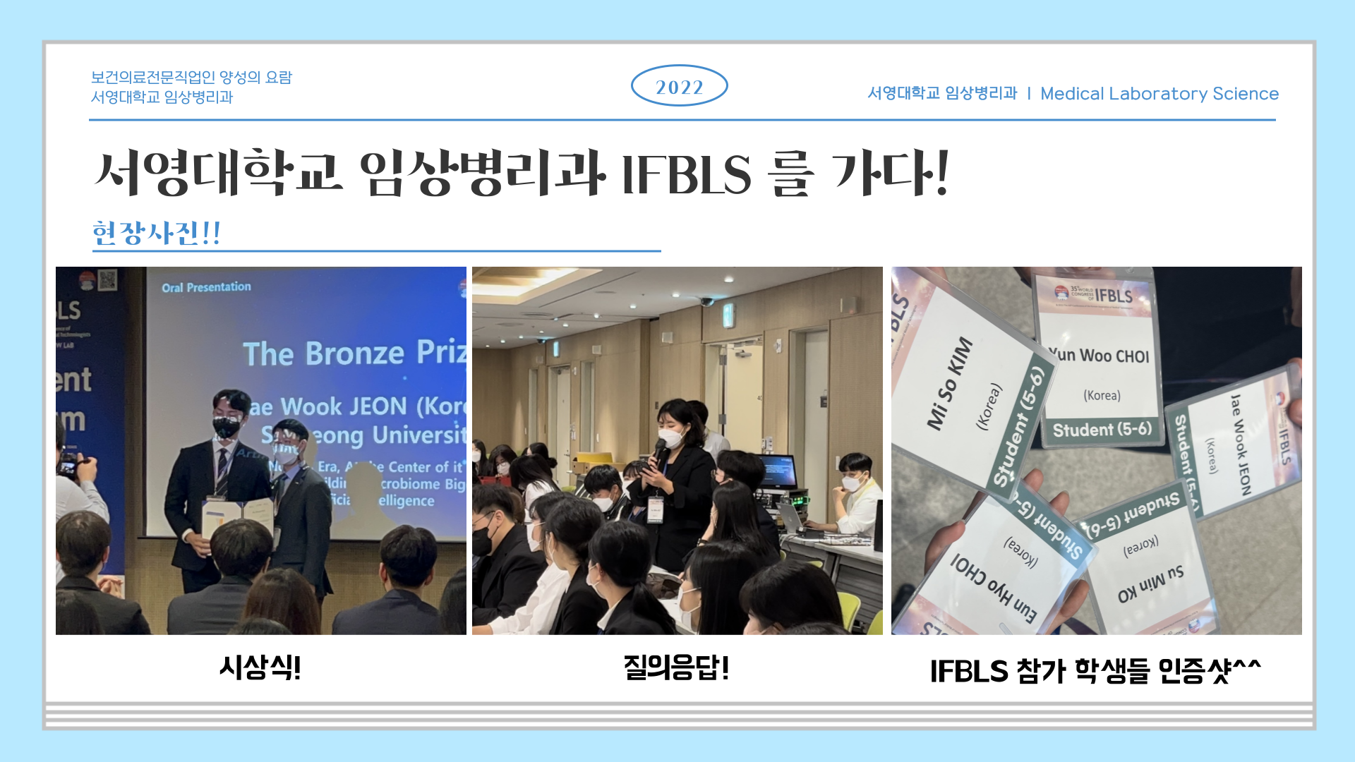 서영대학교 임상병리과는 2022105~9일동안 수원 컨벤션센터에서 개최된 60회 대한임상병리사 종합학술대회, 35회 세계임상병리사연맹(International Federation of Biomedical Laboratory Science, 이하 IFBLS)’ 2022년 학생포럼에서 동상을 수상하였습니다. 학생포럼은 대한임상병리사협회가 주관하여 전국 55개 대학을 대상으로 치열한 예선심사를 통해 그 중 10개 대학만이 본선에 진출하여 ‘Future competence an metaverse of clinical laboratory scientists in the new normal era’ 주제로 우리대학은 2학년 전재욱, 고수민, 김미소, 최윤우, 최은효 학생들은 신환호 교수의 지도하에 참가하여 국내 및 해외 학생들과 경쟁하여 동상이라는 큰 상을 수상하였습니다.!