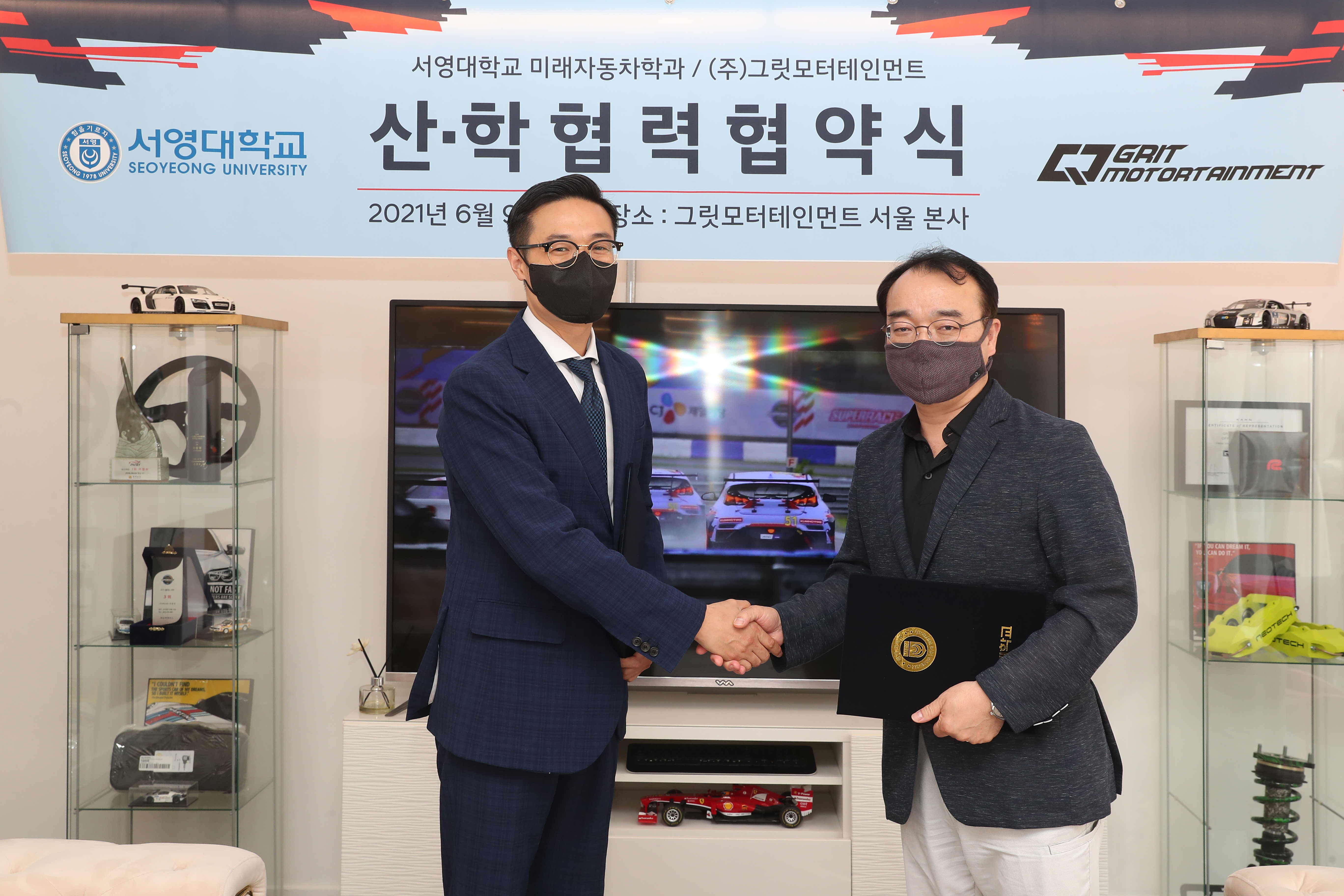 2021년 06월09일 서영대학교 미래자동차과와 그릿모터스포츠팀과 MOU를 체결하였습니다. 협약내용으로는 재학생 모터스포츠 참여 기회 제공, CEO(혹은 팀원)특강을 통한 산학인력교류, 현장실습 및 취업 기회지원, 모터스포츠 및 자동차튜닝 공동 연구 및 상호 간 교류 입니다. 이렇게 다양한 산업체 및 기업과 MOU를 통하여 재학생 및 졸업생분들에게 다양한 역량강화 기회제공, 많은 체험기회 등을 통하여 학훈인 재밋게 놀고, 재밋게 공부하자를 매일매일 실현하는 학과가 되겠습니다! MOU를 통해 재학생들에게 더 좋은 길을 열어주신 그릿모터테인먼트에게 감사드립니다~