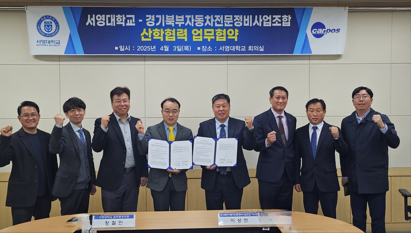 서영대학교 회의실에서 진행된 업무 협약식에는 경기북부자동차전문정비사업조합 이*언 이사장님을 비롯하여 수석 부이사장민, 부이사장님 등 관계자 분들이 참석해 자리를 빛내주셨습니다.