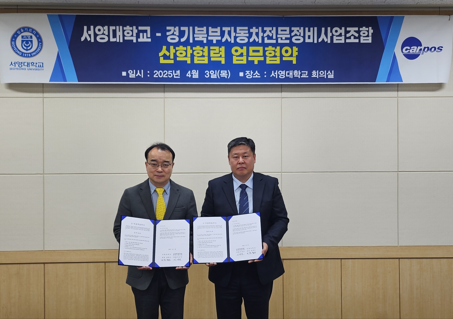 서영대학교 미래자동차과는 43() 경기북부자동차전문정비사업조합과 산학협약을 체결하고 미래 자동차 분야의 우수 인재 양성을 위한 협력 관계를 구축하였습니다.