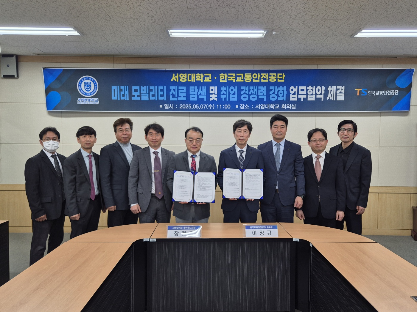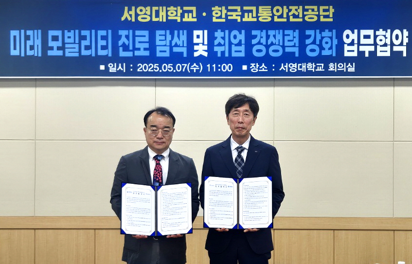 서영대학교와 한국교통안전공단과 미래 자동차 분야의 우수 인재 양성을 위한 산학협력 업무협약을 체결하였다. 5월 7일(수) 서영대학교 회의실 서 진행된 업무 협약식에는 장철인 입학홍보처장, 김명재 학생취업처장, 봉필준 산학협력 부단장, 송락현 미래자동차과 학과장, 김진태 교수 등 본교 관계자와 한국교통안전공단 이장규 본부장, 류병의 처장, 김대정 부장, 최재일 차장 등 양 기관 관계자들이 참석하였습니다. 진행된 협약식은 양 기관 대표의 인사말을 시작으로 협약서 주요 내용 소개, 협약서 서명, 관련 학과 시설 견학 순으로 진행되었습니다. 양 기관 은 이번 협약을 통해 친환경 모빌리티 신기술 진로 탐색 및 취업 경쟁력 강화와 경기도 RISE사업에 따른 지역 인재 양성을 위해 상호 협력하기로 하였습니다.