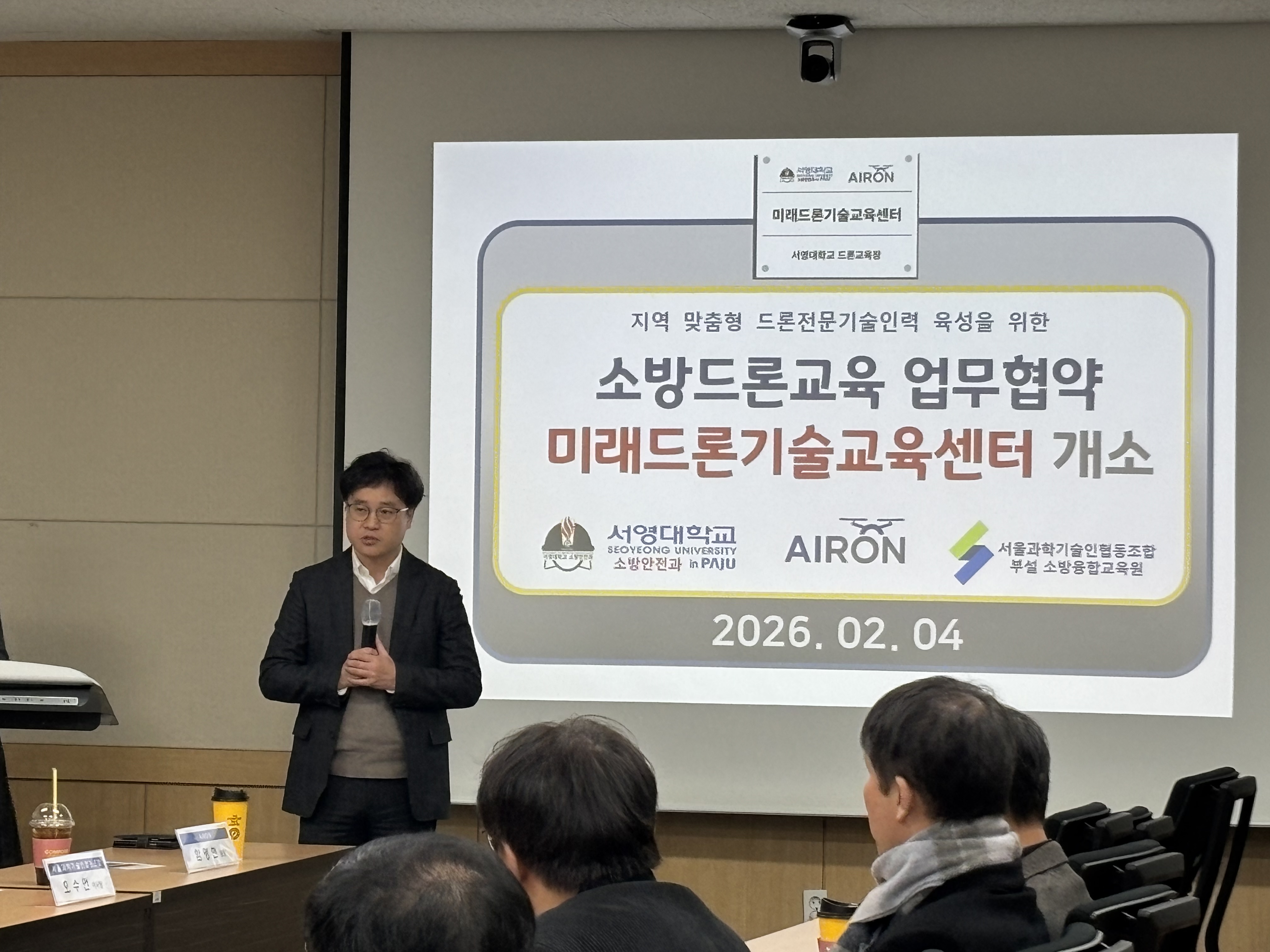 ■ 산학 협력 통한 [소방 드론] 전문 인프라 구축 O 서영대학교 파주캠퍼스(총장 김정수)는 2월 4일(화) 드론 전문 교육기관인 AIRON 드론교육원, 서울과학기술인협동조합(부설 소방융합교육원)과 함께 소방·재난 안전 분야에 특화된 드론 전문 인재 양성을 위한 업무협약을 체결하고, 미래드론기술교육센터 개소식을 개최하였다. 서영대학교 회의실에서 진행된 업무협약식에는 장철인 입학부총장, 천종철 미래평생교육원장, 김용철 ESG경영과 학과장, 이정균 소방안전과 학과장을 비롯한 서영대학교 관계자와 함영현 AIRON 드론교육원 원장, 오수언 서울과학기술인협동조합 이사장 등 각 기관 주요 관계자들이 참석해 자리를 빛냈다.