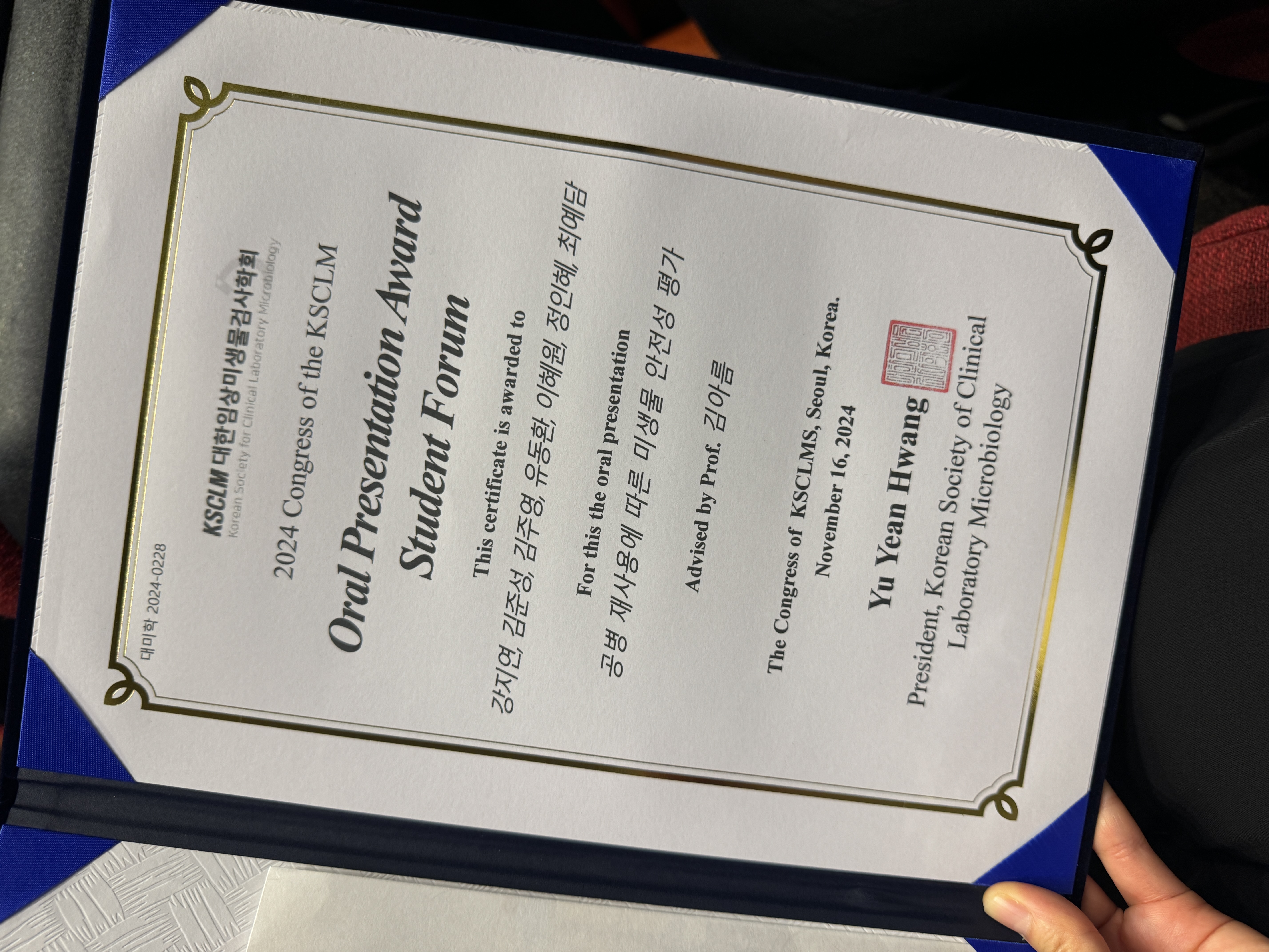 난 11월 16일, 우리 대학은 신촌세브란스병원에서 열린 '대한임상미생물검사학회 제 2회 학생포럼'에서 최우수상을 수상했다.
