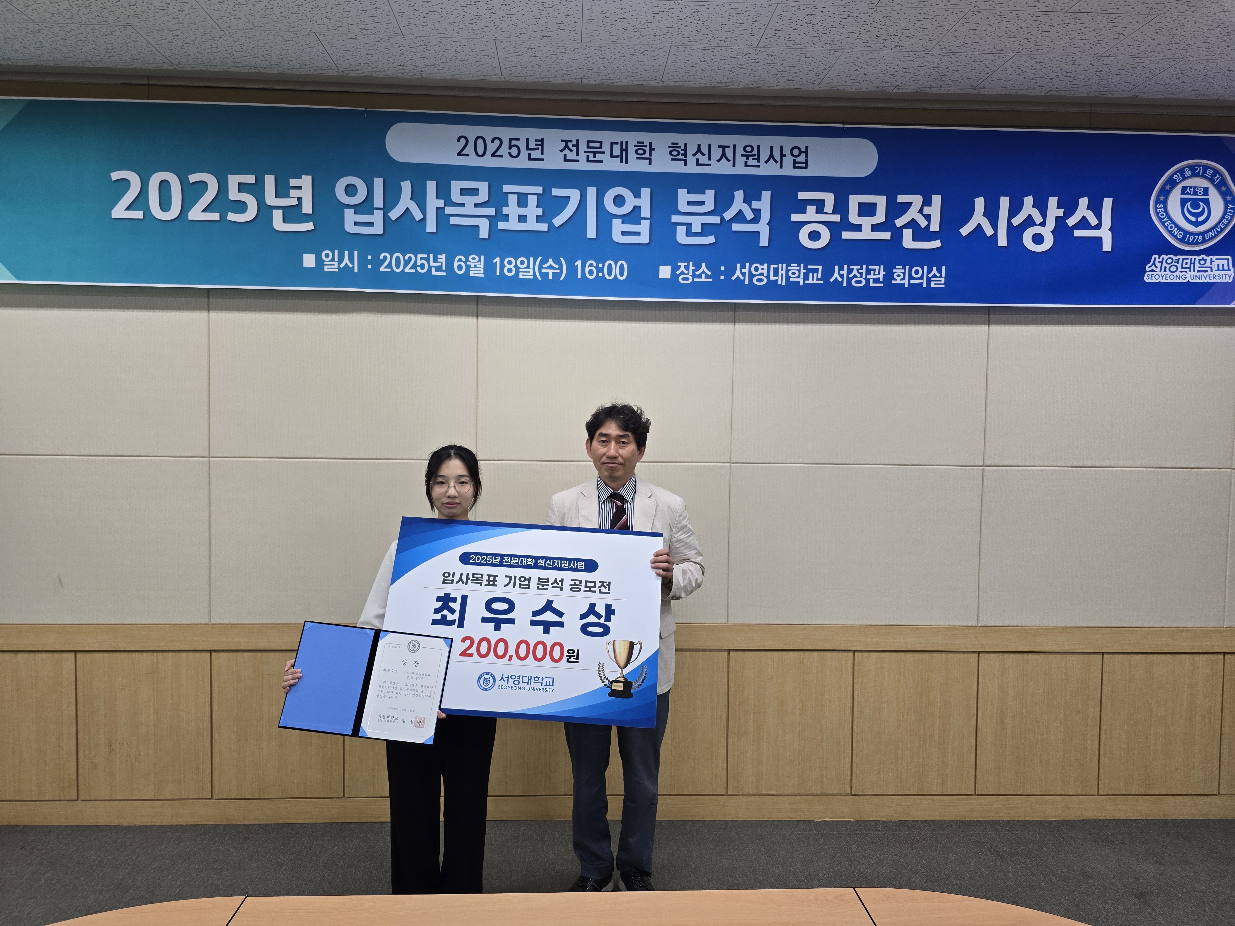 O. 우리대학(총장 김정수) 학생취업처(처장 김명재)는 6월 18일(수) 2025년 전문대학 혁신지원사업의 일환으로 2025년 서영대학교 입사목표기업 분석 공모전 시상식을 진행하였다. 서정관 회의실에서 진행된 행사에는 김명재 취업처장을 비롯하여 학생취업처 교직원 8명과 재학생 수상자 16명 등이 참석하였다.