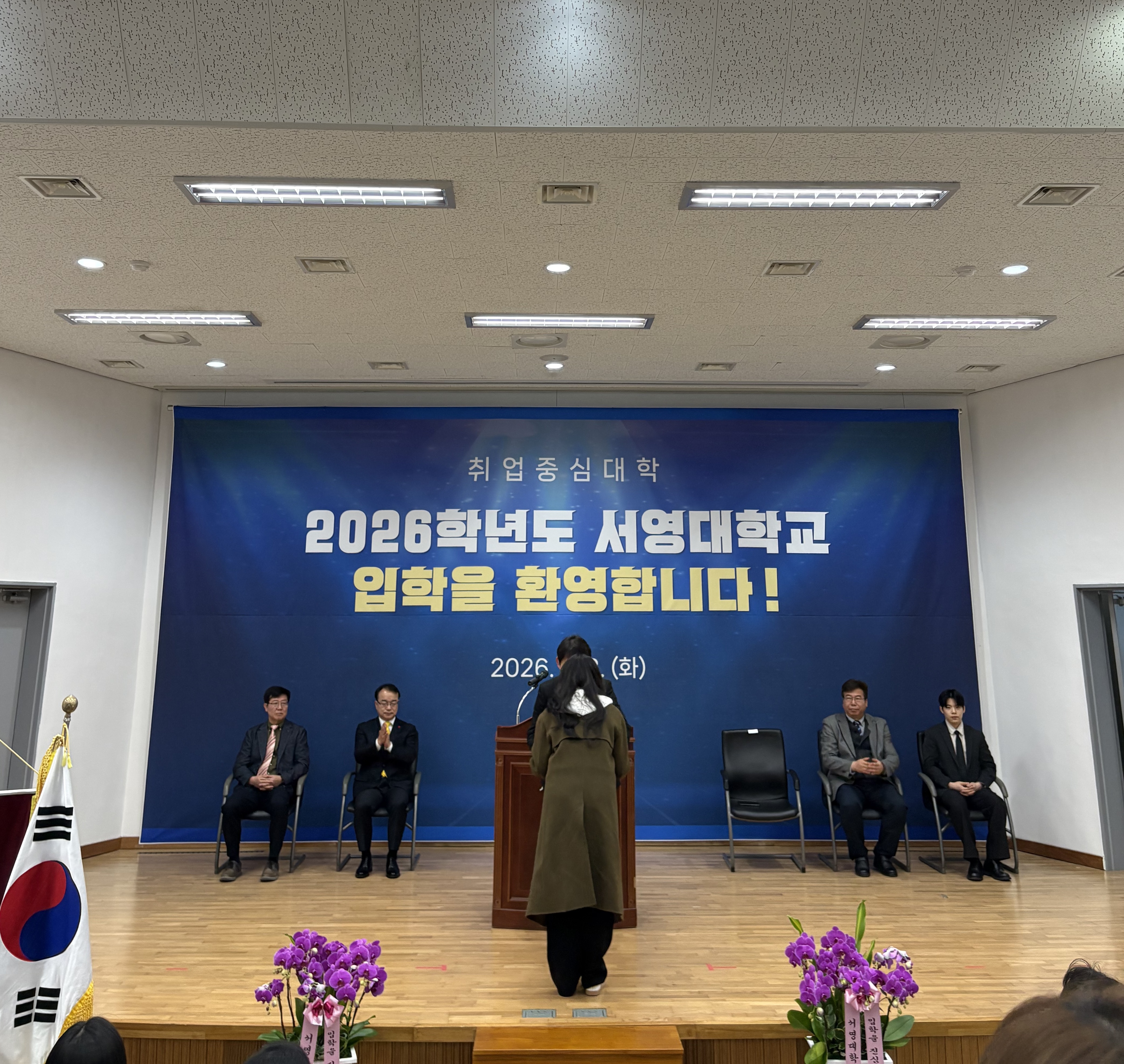○ 우리대학(총장 김정수)은 3월 3(화) ‘2026학년도 서영대학교 입학식을 개최하였다서영대학교 서강홀에서 진행된 이번 입학식에는 장철인 입학부총장, 김명재 취업처장, 김희재 기획부처장을 비롯한 학교 관계자와 교직원, 내빈, 신입생과 이를 축하하기 위한 가족 및 내빈이 참석하였다. 신입생들이 뜻깊은 순간을 함께할 수 있도록 주간반 신입생을 위한 주간 입학식과 야간반 신입생을 위한 야간 입학식으로 나누어 총 두 차례에 걸쳐 진행되었다.